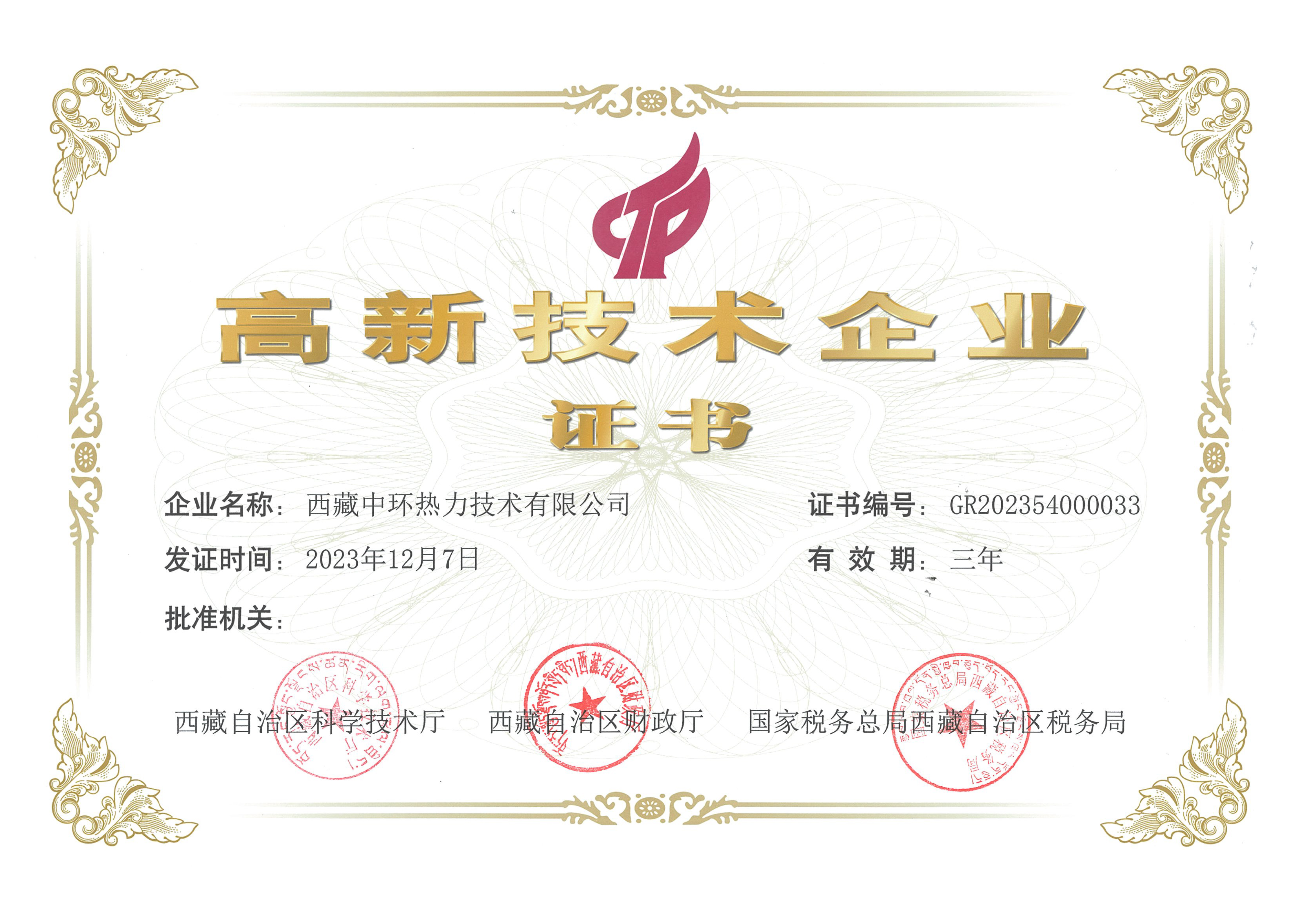- 高新技術企業證書(西藏中環熱力)